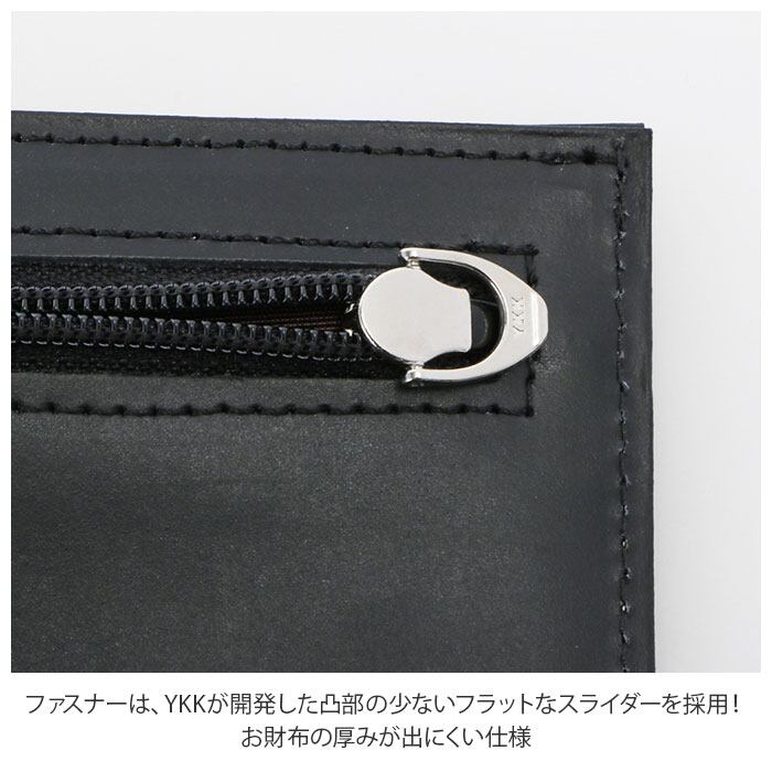 ・小銭入れはマチ付き。ファスナーは、YKKが開発した凸部の少ないフラットなスライダーを採用!お財布の厚みがでにくい仕様。