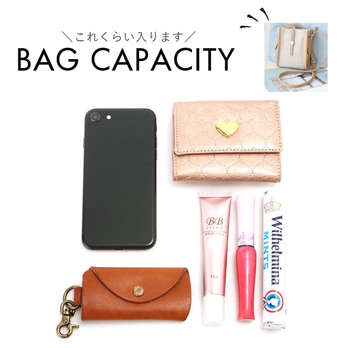 ・メインポケットは、スマートフォンや二つ折り財布、コスメなど、必要最低限の小物が収納できるコンパクト設計。内側には便利なカードポケット×1。