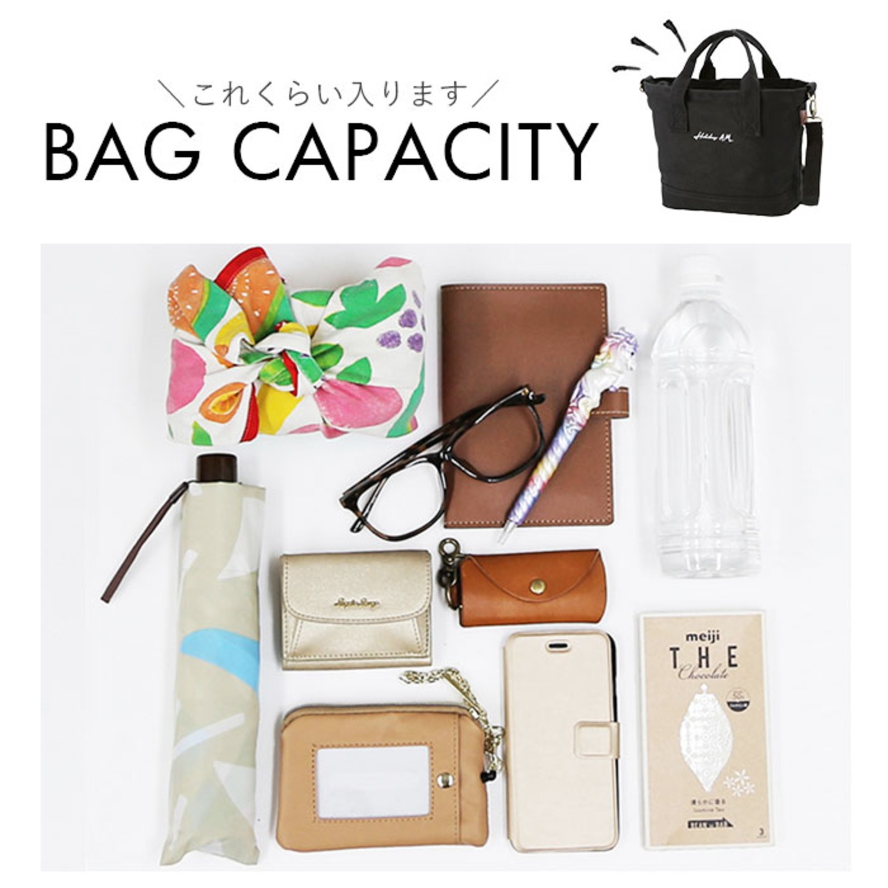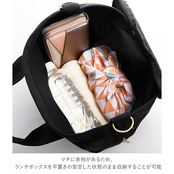 ・小ぶりな見た目ながら、深さもバッチリあり、ランチバッグとしてだけでなく、化粧ポーチや手帳など、身の回りの小物がしっかりと収納できる使い勝手のいいサイズ。