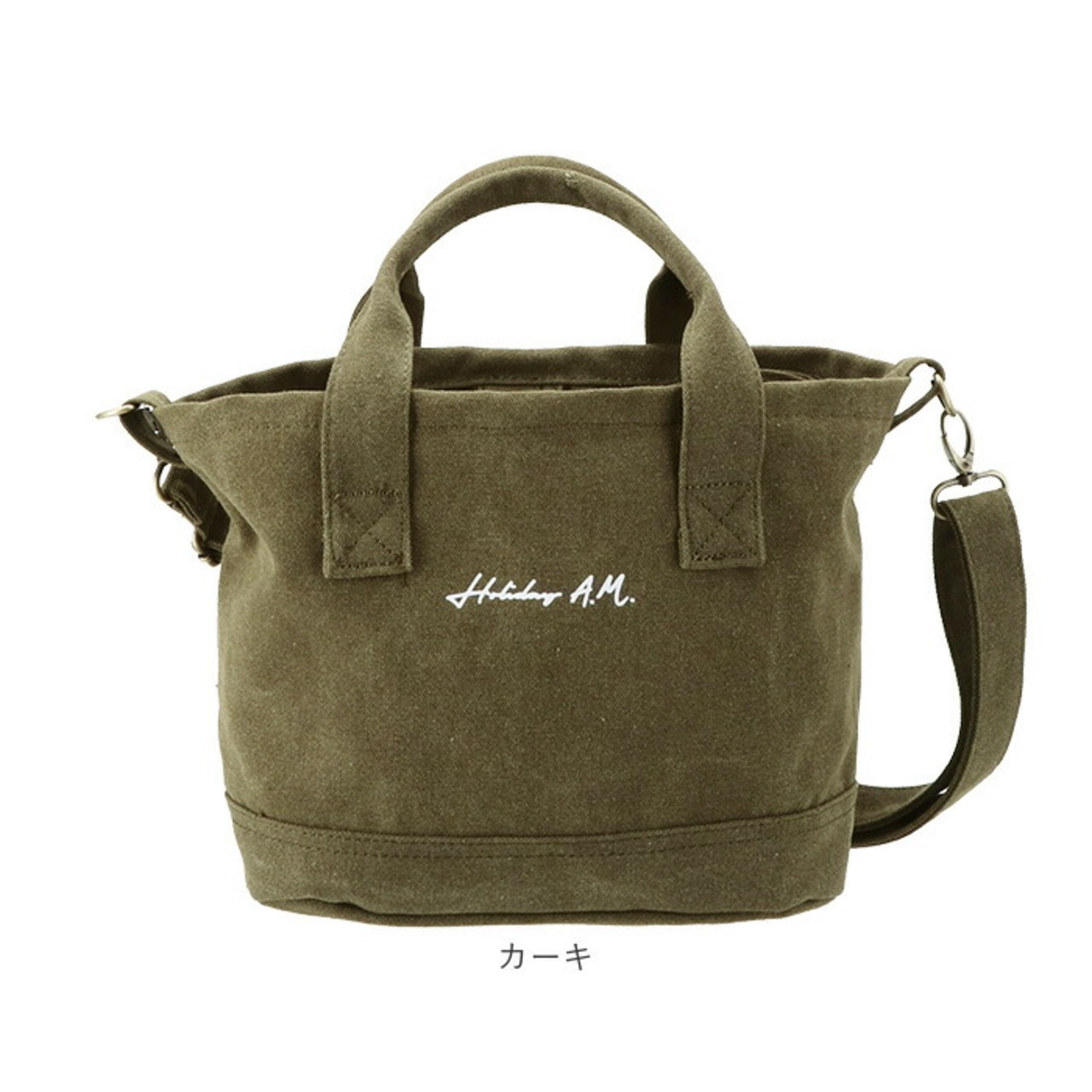 ・丈夫で素朴な風合いの16オンスキャンバス素材を使用した、Holiday A.M.(ホリデーエーエム)の2WAYランチバッグ。フロントにロゴを小さく配置したのみのシンプルな外観。