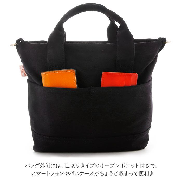 ・バッグ外側には、スマートフォンやパスケースがちょうど収まる仕切りタイプのオープンポケット付き。