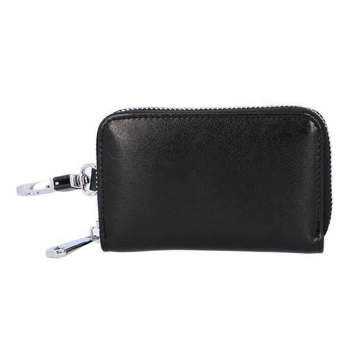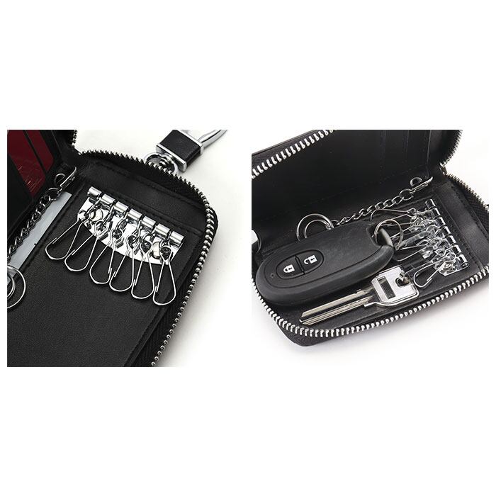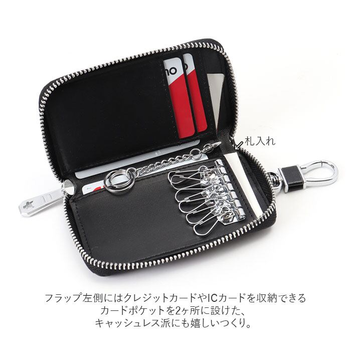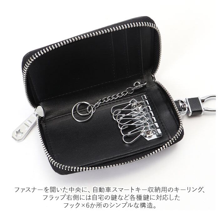・ファスナーを開いた中央に、自動車スマートキー収納用のキーリング、フラップ右側には自宅の鍵など各種鍵に対応したフック×6か所のシンプルな構造。