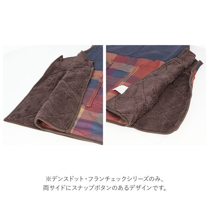 ・身頃左側のスナップを2つ留めるだけで、着脱が楽ちん。上からサッと被って着てもOK!(※デンスドット・フランチェックシリーズのみ、両サイドにスナップボタンのあるデザインです。)