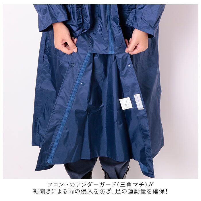 ・フロントのアンダーガード(三角マチ)が裾開きによる雨の侵入を防ぎ、足の運動量を確保!