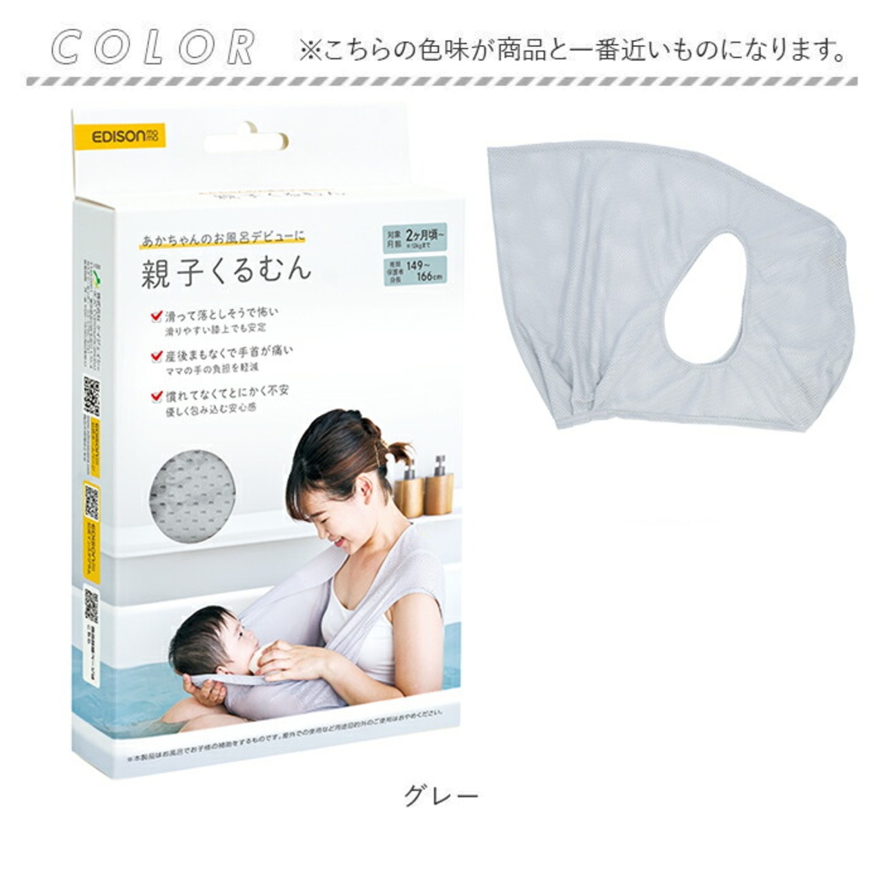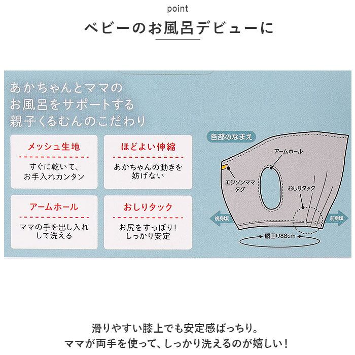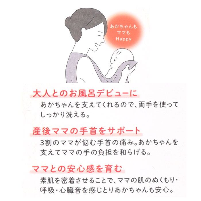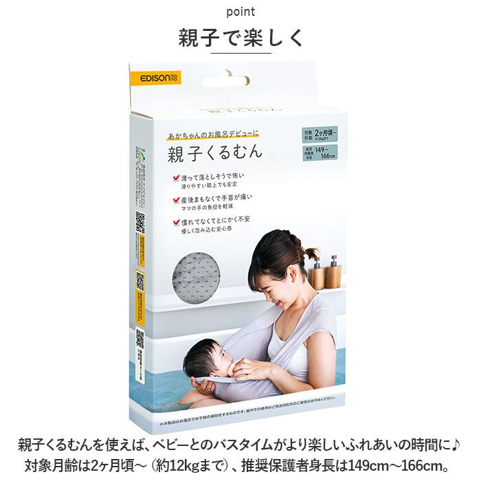 ・親子くるむんを使えば、ベビーとのバスタイムがより楽しいふれあいの時間に♪対象月齢は2ヶ月頃〜(約12kgまで)、推奨保護者身長は149cm〜166cm。
