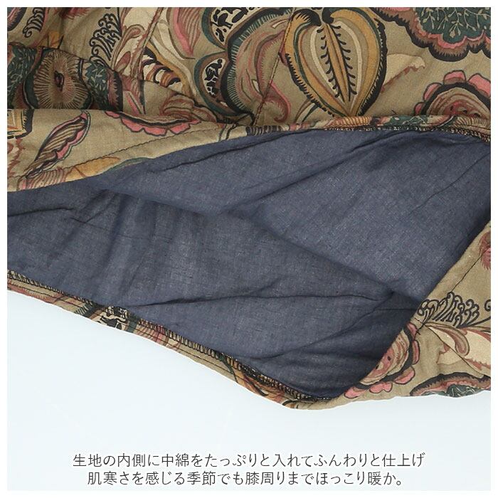 ・生地の内側に中綿をたっぷりと入れてふんわりと仕上げ、肌寒さを感じる季節でも膝周りまでほっこり暖か。