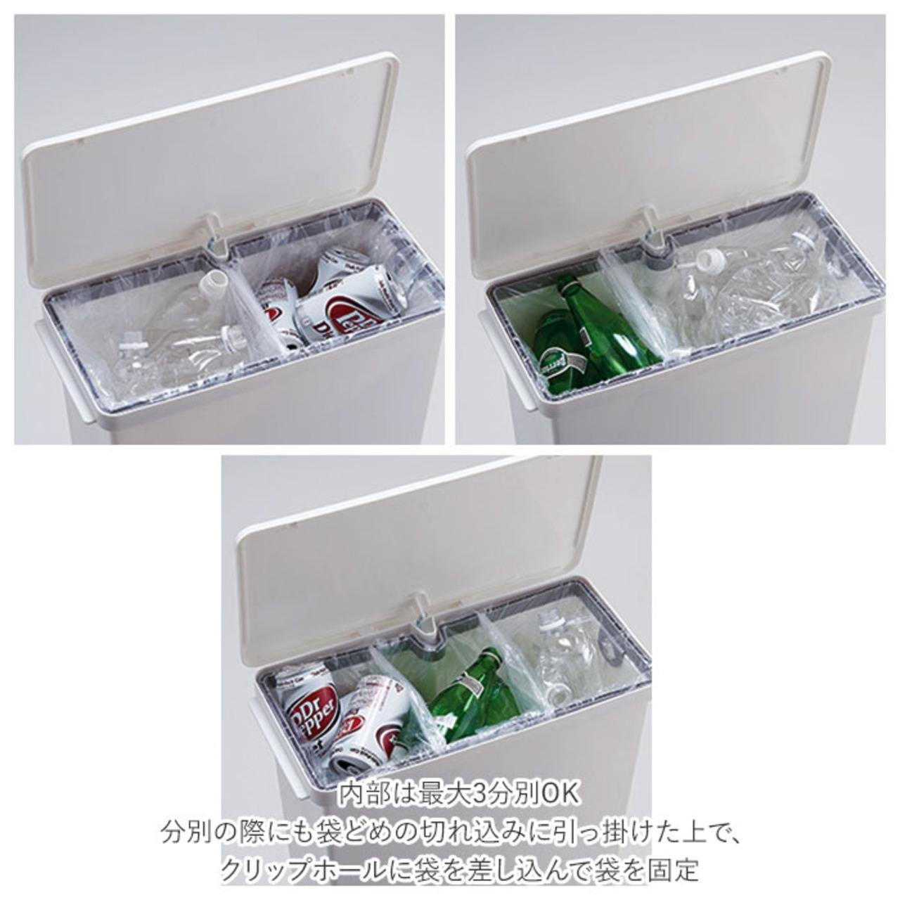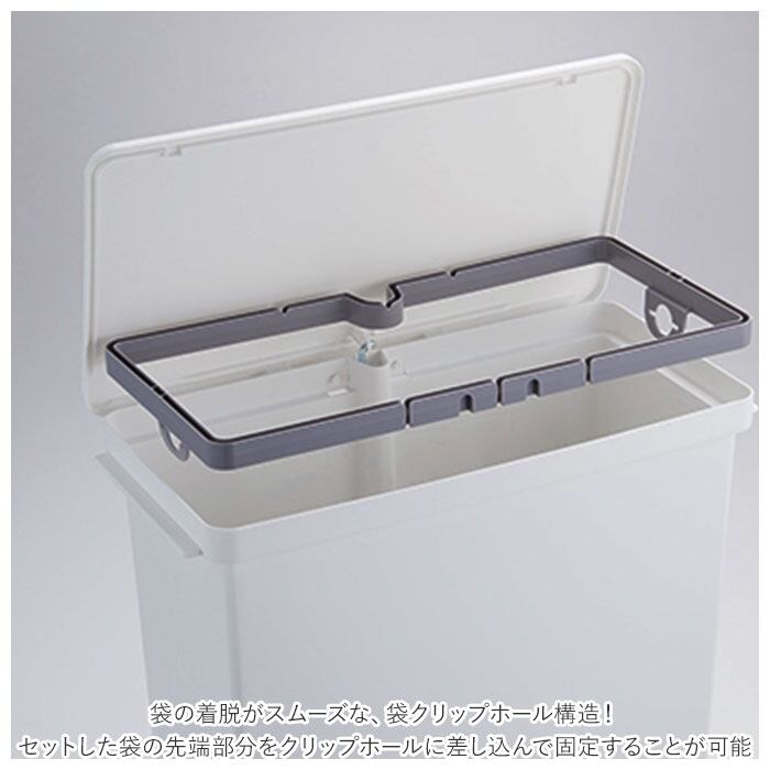 ・内部は最大3分別OK。分別の際にも袋どめの切れ込みに引っ掛けた上で、クリップホールに袋を差し込んで袋を固定。