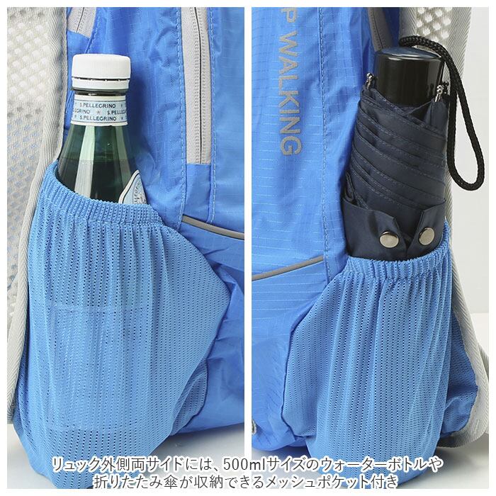 ・リュック外側両サイドには、500mlサイズのウォーターボトルや折りたたみ傘が収納できるメッシュポケット付き。