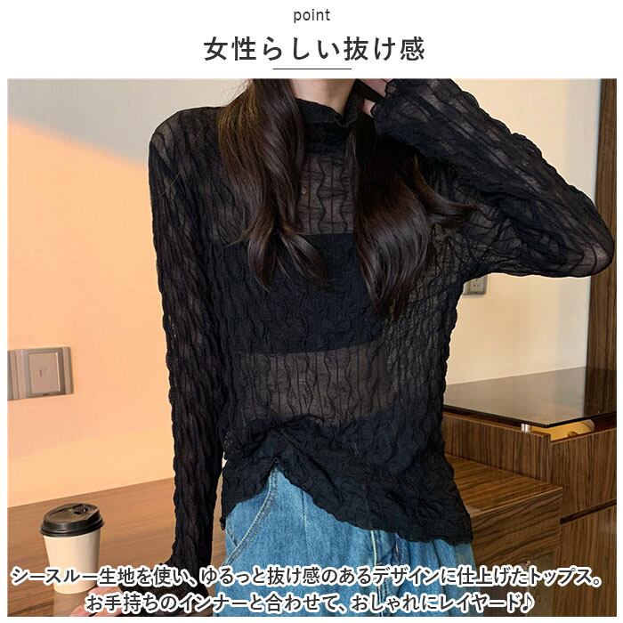 ・シースルー生地を使い、ゆるっと抜け感のあるデザインに仕上げたトップス。お手持ちのインナーと合わせて、おしゃれにレイヤード♪