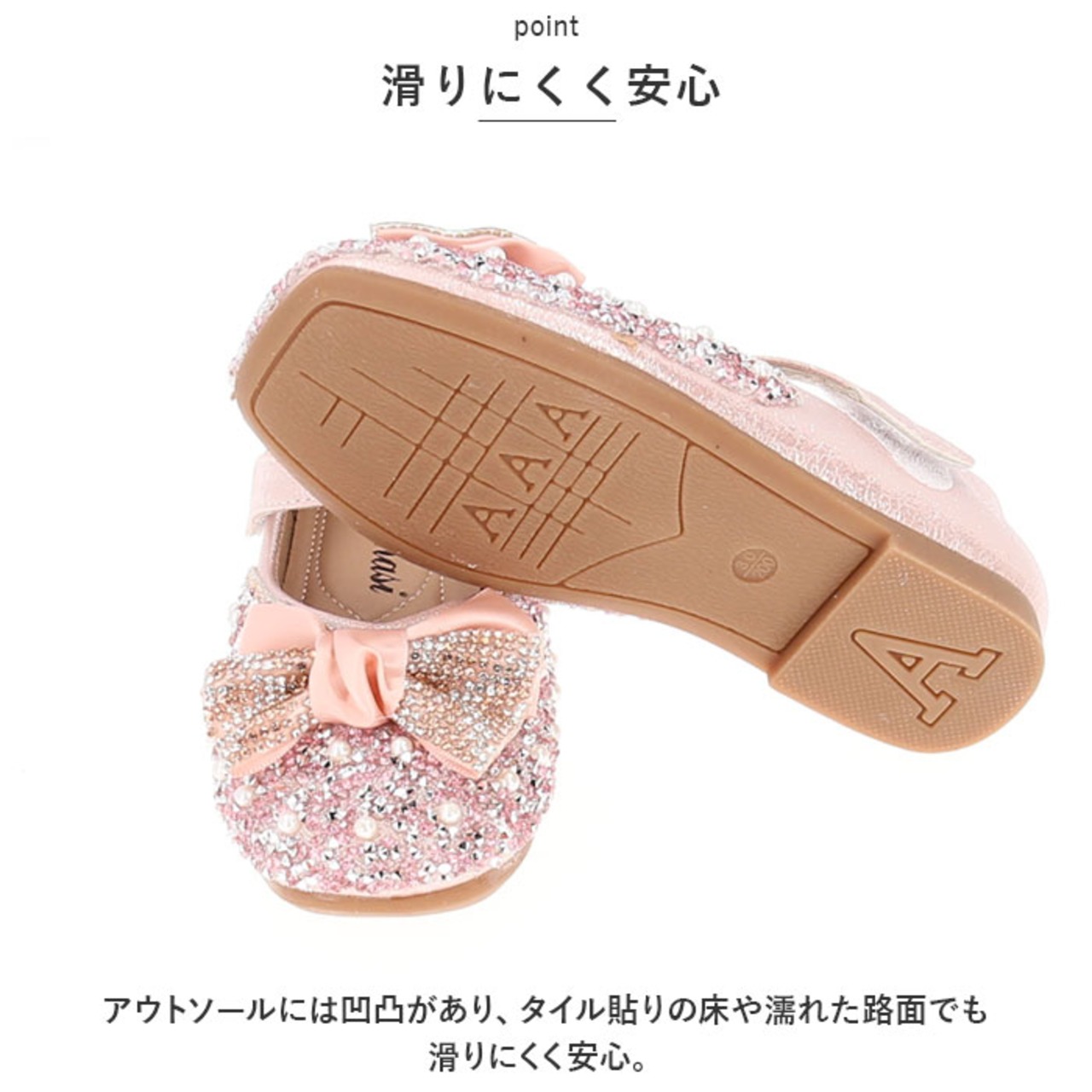 ・アウトソールには凹凸があり、タイル貼りの床や濡れた路面でも滑りにくく安心。