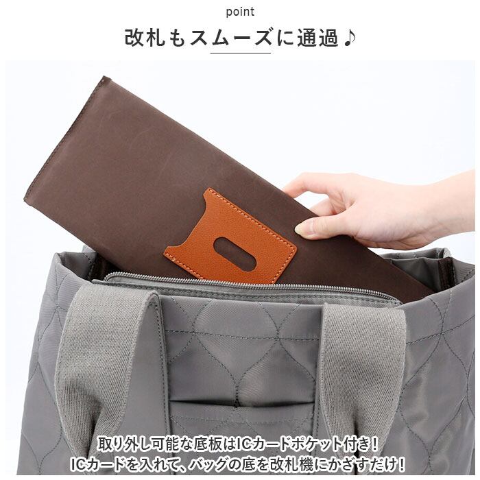 ・取り外し可能な底板はICカードポケット付き!ICカードを入れて、バッグの底を改札機にかざすだけ!