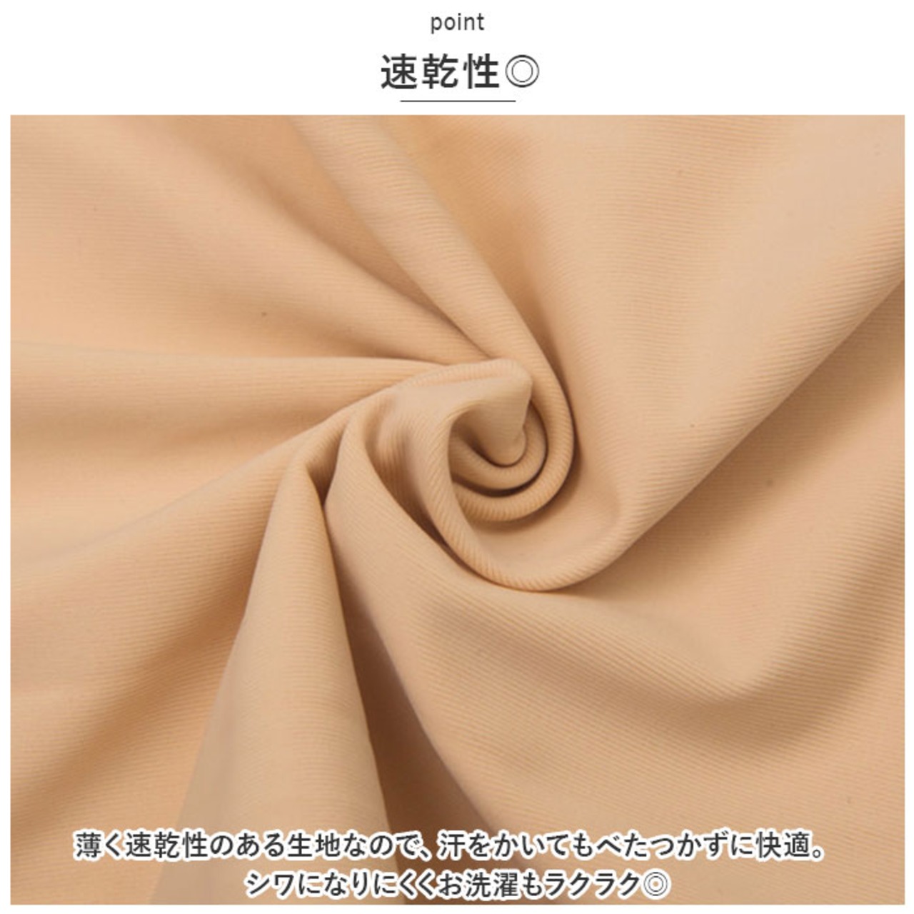 ・薄く速乾性のある生地なので、汗をかいてもべたつかずに快適。シワになりにくくお洗濯もラクラク◎
