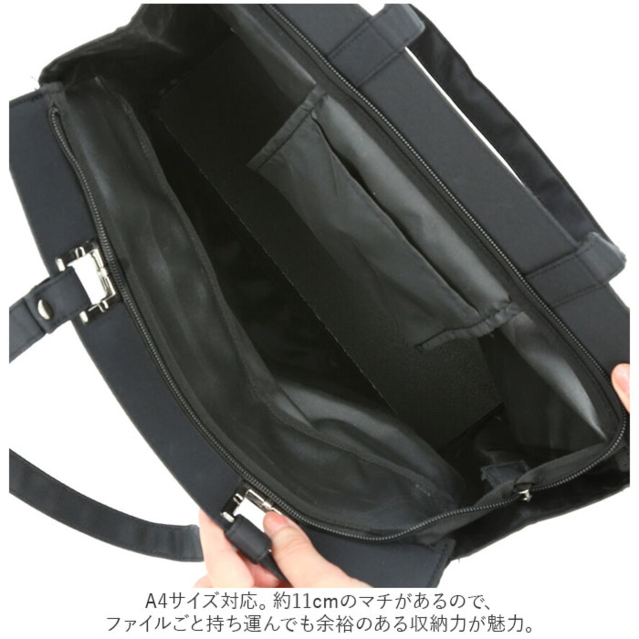 ・A4サイズ対応。約11cmのマチがあるので、ファイルごと持ち運んでも余裕のある収納力が魅力。