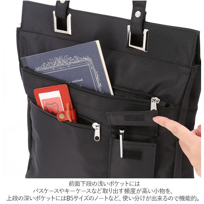 ・前面下段の浅いポケットにはパスケースやキーケースなど取り出す頻度が高い小物を、上段の深いポケットにはB5サイズのノートなど、使い分けが出来るので機能的。