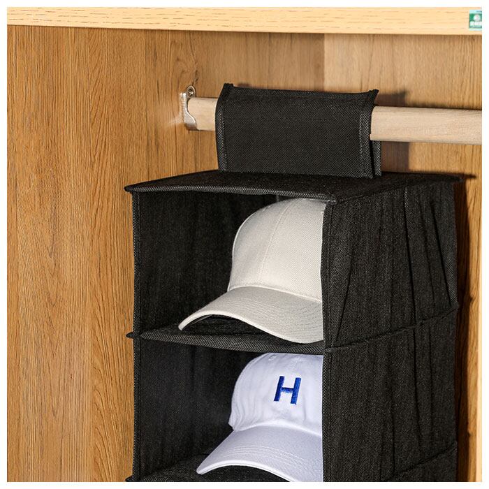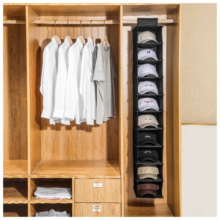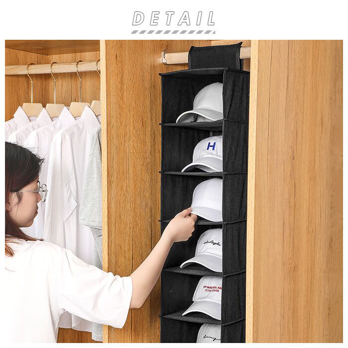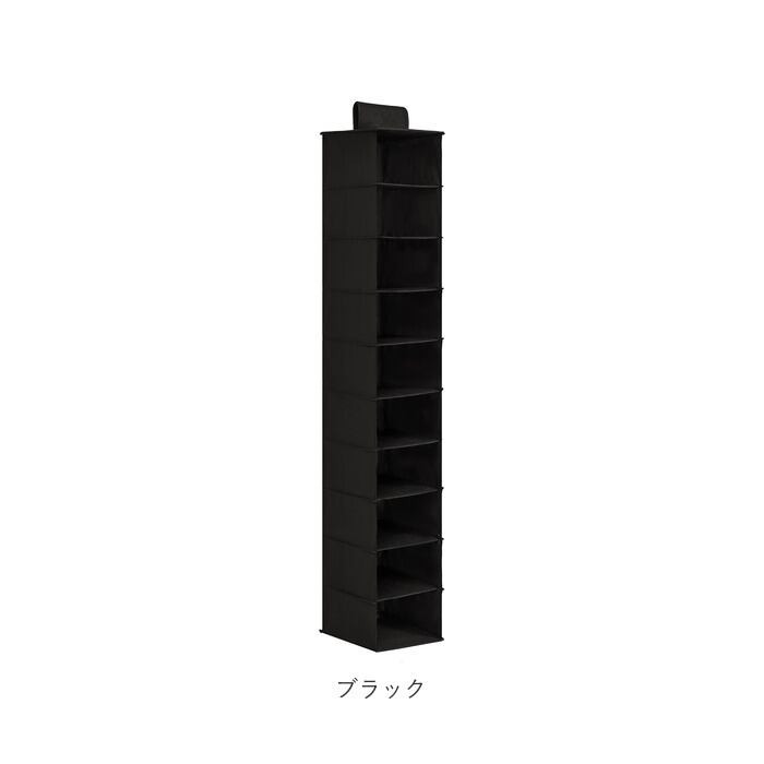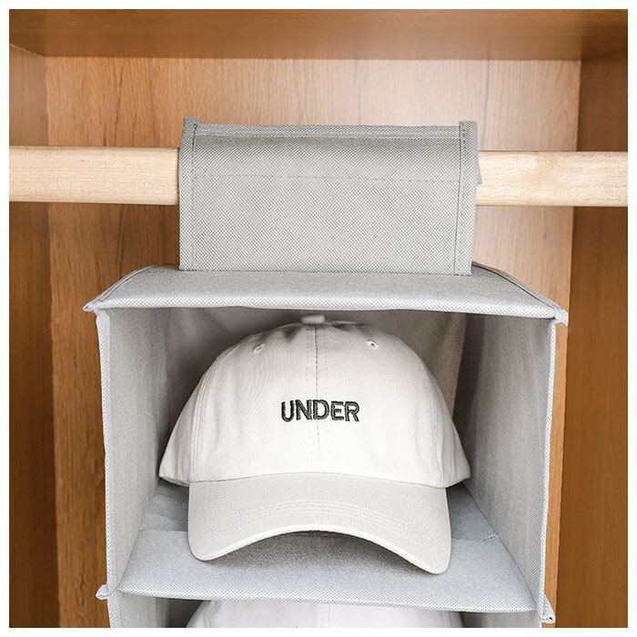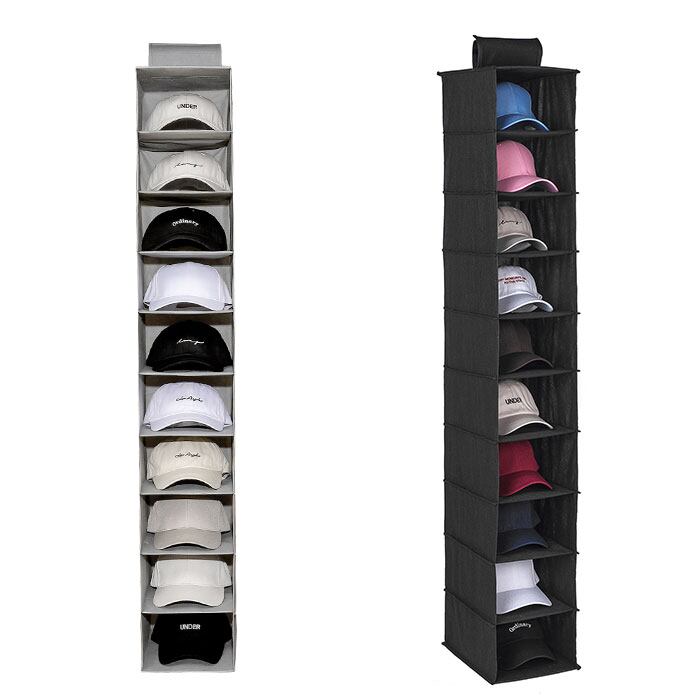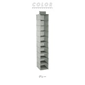 ・高さ:約15cm、奥行き:約29cmのキューブ状収納スペースが縦に10個連なった、不織布製の帽子専用収納ラック。