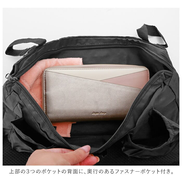 ・上部の3つのポケットの背面に、奥行のあるファスナーポケット付き。おむつやウェットティッシュ、あまり見せたくないものを入れておくのに便利。