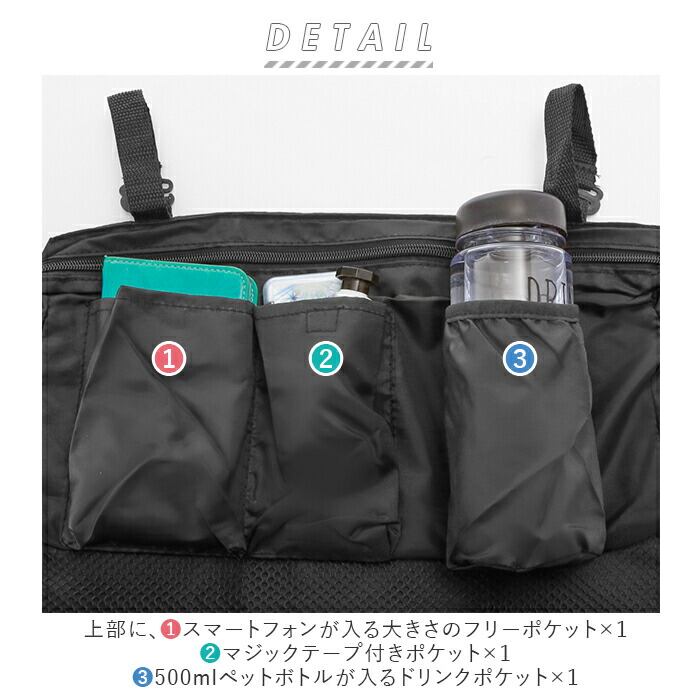 ・上部に、スマートフォンが入る大きさのフリーポケット×1つ、面ファスナー(マジックテープ式)付きポケット1つ、500mlペットボトルが入るドリンクポケット1つ、3つの自分仕様に使える便利なポケット。