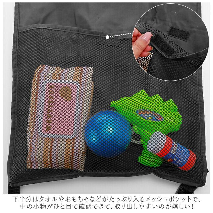 ・下半分はタオル類やお子さまのおもちゃなどがたっぷり入るメッシュポケットで、中の小物がひと目で確認できて、取り出しやすいのが嬉しい!