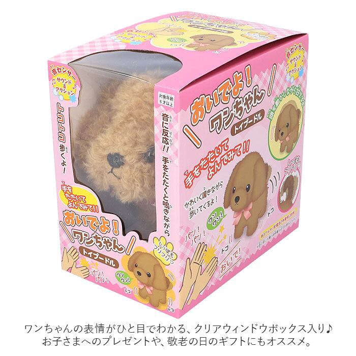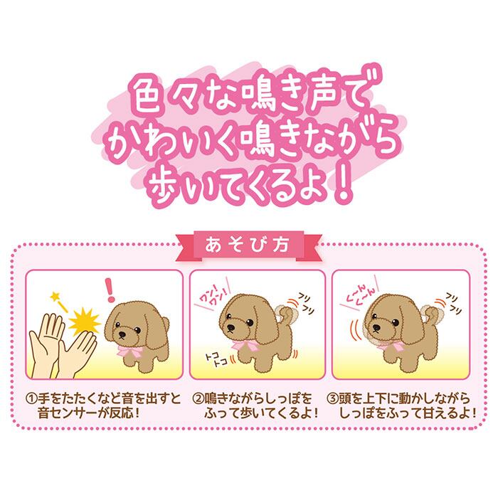 ・手を「パンパン」と軽くたたいたり、ワンちゃんの名前を呼び掛けると音センサーが反応!「ワンワンッ」と可愛く鳴きながら、きみのところへトコトコ歩いてくるよ♪