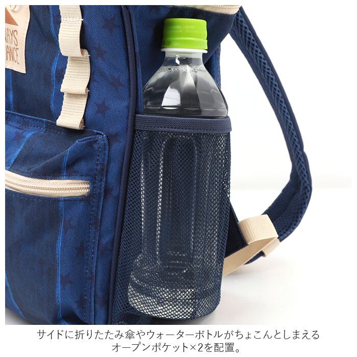 ・サイドに折りたたみ傘やウォーターボトルがちょこんとしまえるオープンポケット×2を配置。