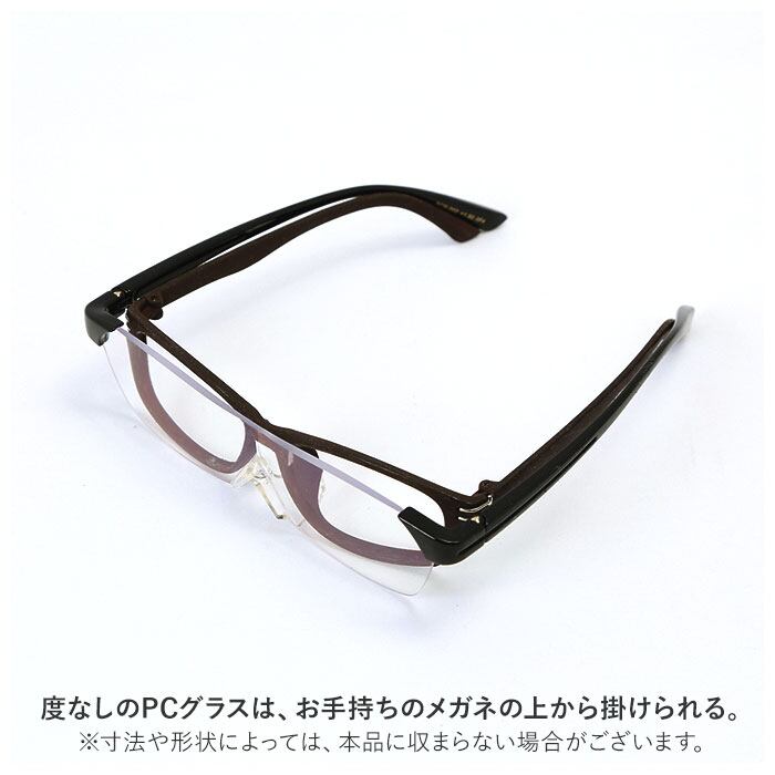 ・度なしのPCグラスはお手持ちのメガネの上から掛けられる(適合寸法よりお手持ちのメガネが小さくても形状によっては本品に収まらない場合があります)