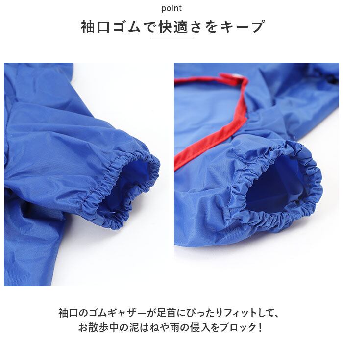 ・袖口のゴムギャザーが足首にぴったりフィットして、お散歩中の泥はねや雨の侵入をブロック!