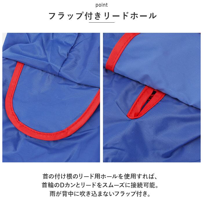 ・首の付け根のリード用ホールを使用すれば、首輪のDカンとリードをスムーズに接続可能。雨が背中に吹き込まないフラップ付き。