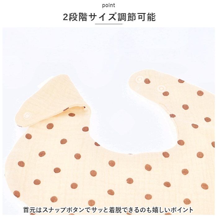 ・首元はスナップボタンで2段階サイズ調節が可能。サッと着脱できるのも嬉しいポイント。