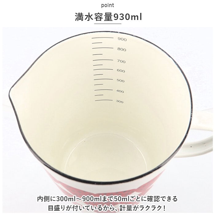 ・満水容量930ml。内側に300ml〜900mlまで50mlごとに確認できる目盛りが付いているから、計量がラクラク!