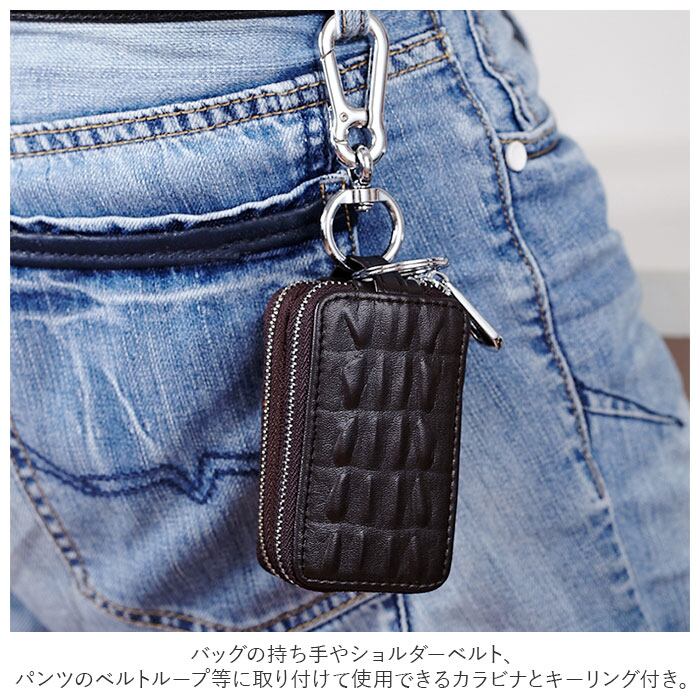 ・バッグの持ち手やショルダーベルト、パンツのベルトループ等に取り付けて使用できるカラビナとキーリング付き。