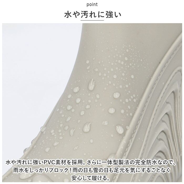 ・水や汚れに強いPVC素材を採用。さらに一体型製法の完全防水なので、雨水をしっかりブロック!雨の日も雪の日も足元を気にすることなく安心して履ける。