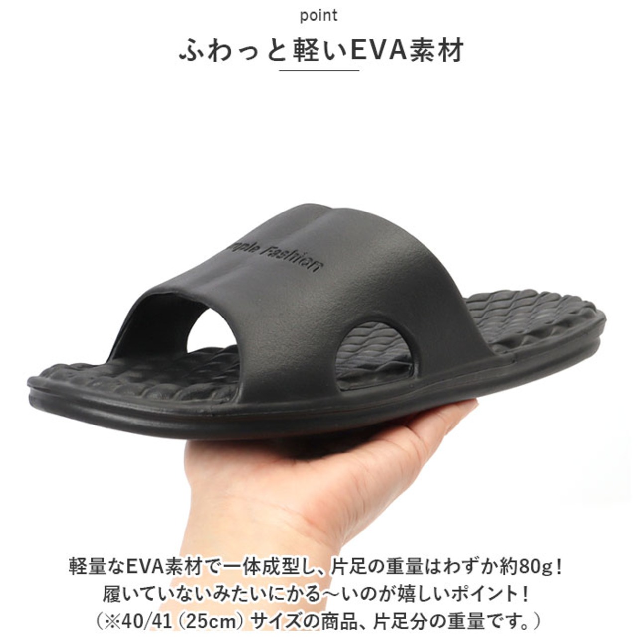 ・軽量なEVA素材で一体成型し、片足の重量はわずか約80g!履いていないみたいにかる〜いのが嬉しいポイント!(※40/41(25cm)サイズの商品、片足分の重量です。)
