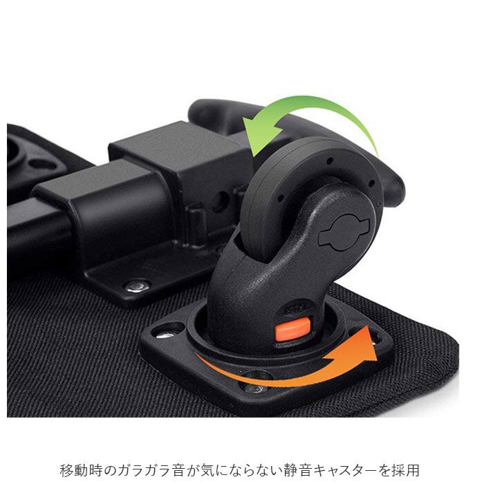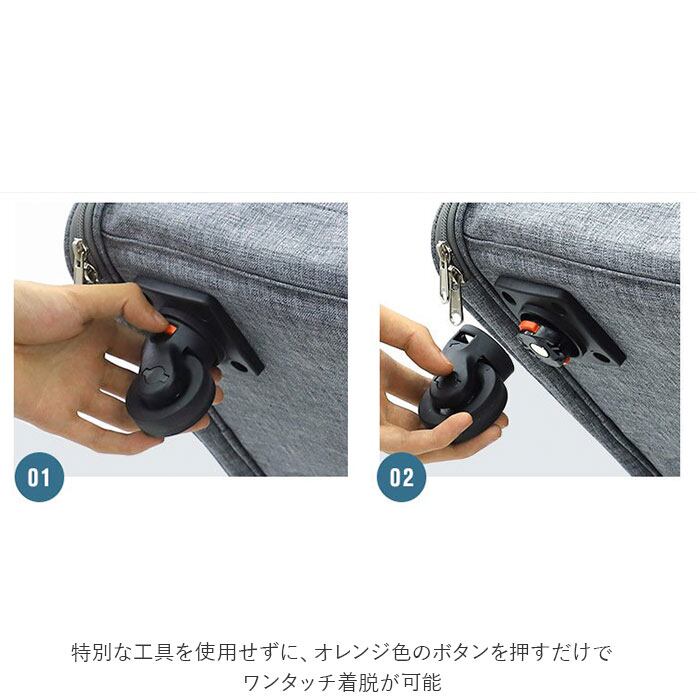 ・移動時のガラガラ音が気にならない静音キャスターを採用。特別な工具を使用せずに、オレンジ色のボタンを押すだけでワンタッチ着脱が可能。