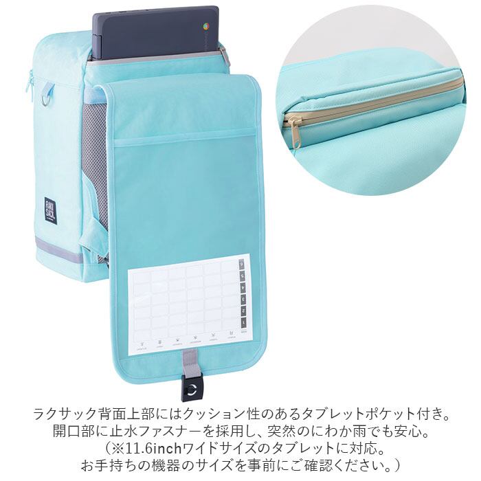 ・ラクサック背面にはタブレットポケット付き。開口部に止水ファスナーを採用し、突然のにわか雨でも安心。(※11.6inchワイドサイズのタブレットに対応。)