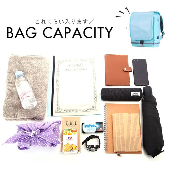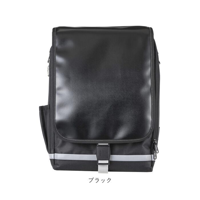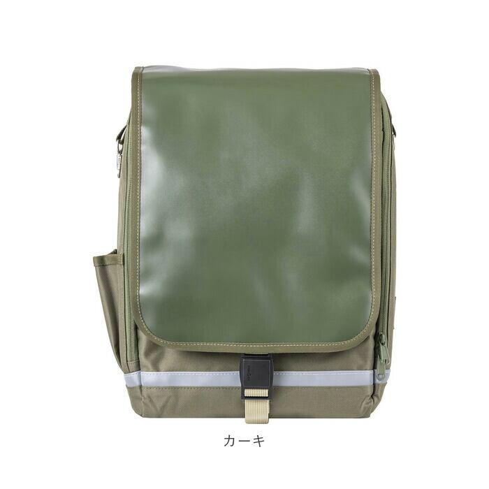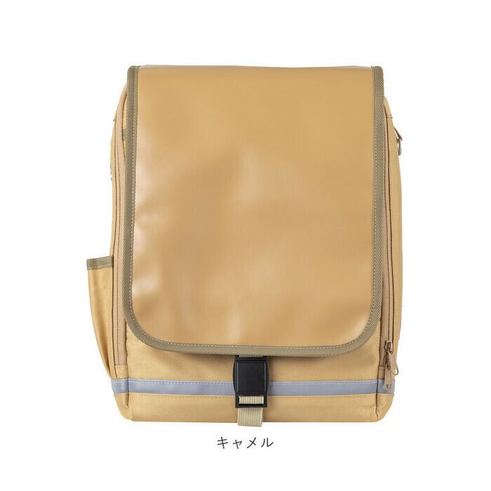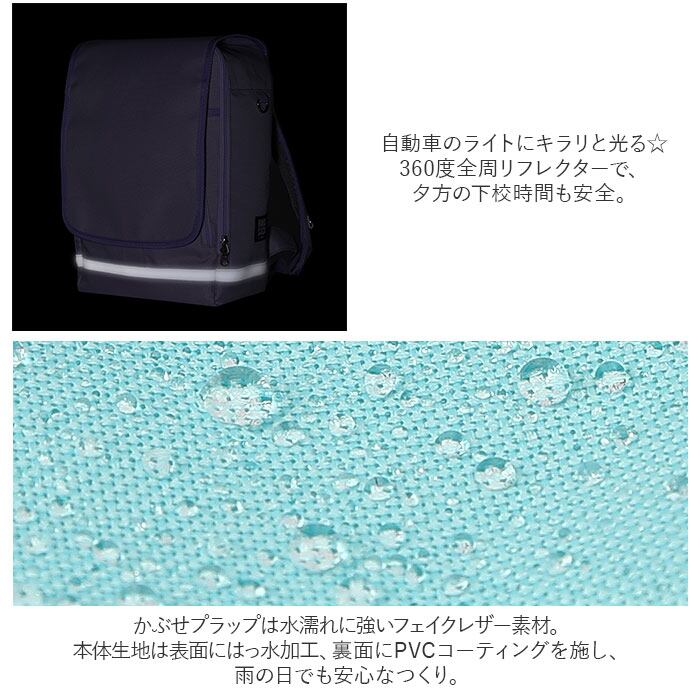 ・かぶせプラップは水濡れに強いフェイクレザー素材。本体生地は表面にはっ水加工、裏面にPVCコーティングを施し、雨の日でも安心。