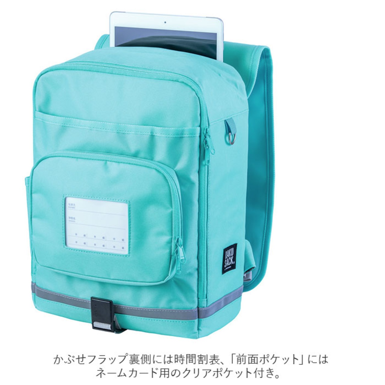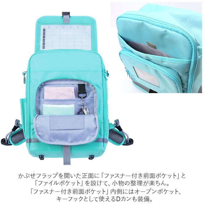 ・かぶせフラップ裏側に時間割表、「前面ポケット」にはネームカード用のクリアポケット付き。(※ラクサックメーカーHPでダウンロードが可能です。)