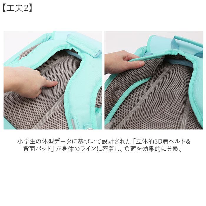 ・【工夫2】小学生の体型データに基づいて設計された「立体的3D肩ベルト&背面パッド」が身体のラインに密着し、負荷を効果的に分散。