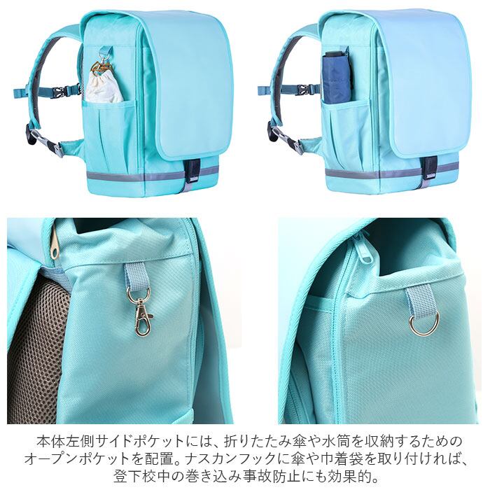 ・左側サイドポケットには折り畳み傘や水筒を収納するためのオープンポケットを配置。ナスカンに傘や巾着袋を取り付ければ、登下校中の巻込み事故も防止!