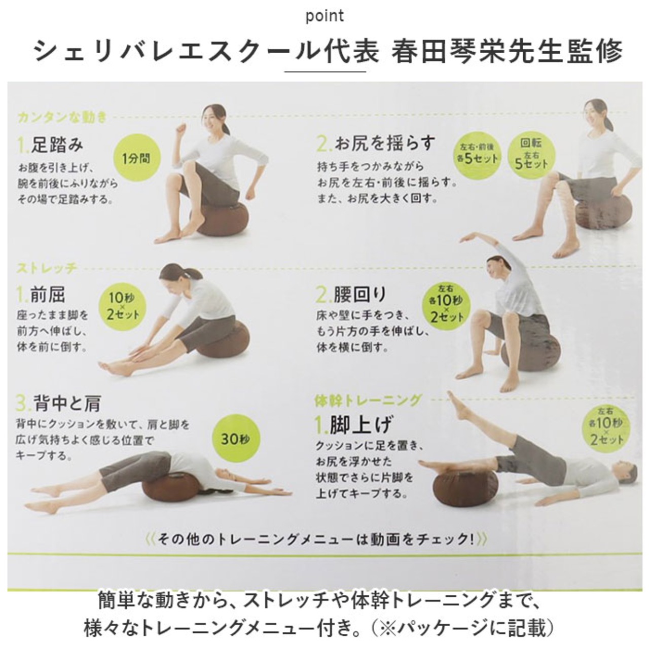 ・簡単な動きから、ストレッチや体幹トレーニングまで、様々なトレーニングメニュー付き。(※パッケージに記載)