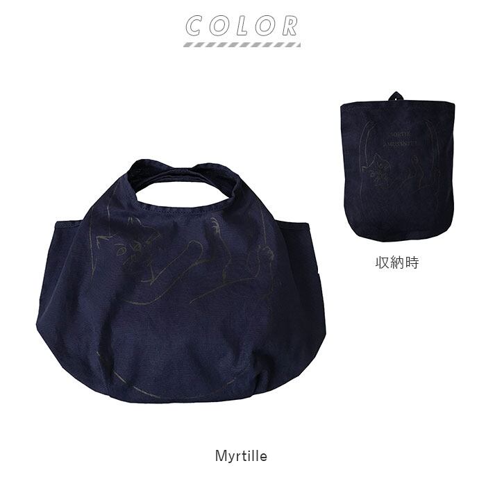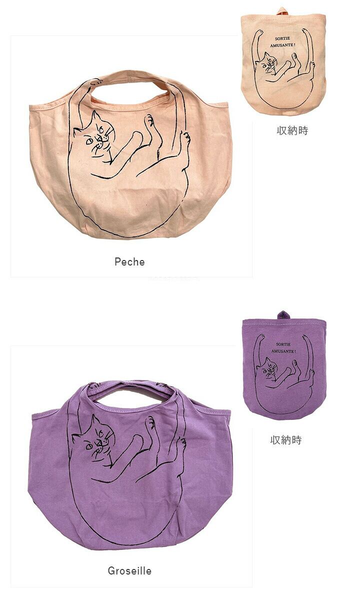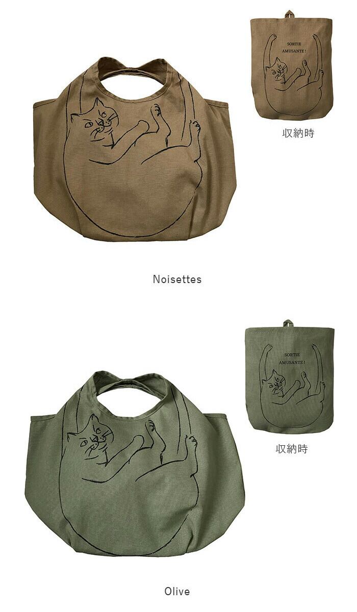 ・ネコ好き必見!持つとネコがぶら下がるようなデザイン。1色手書きタッチで甘さが無いので使いやすいデザイン。たっぷりマチでコロンとしたフォルムの可愛いコットンバッグ。