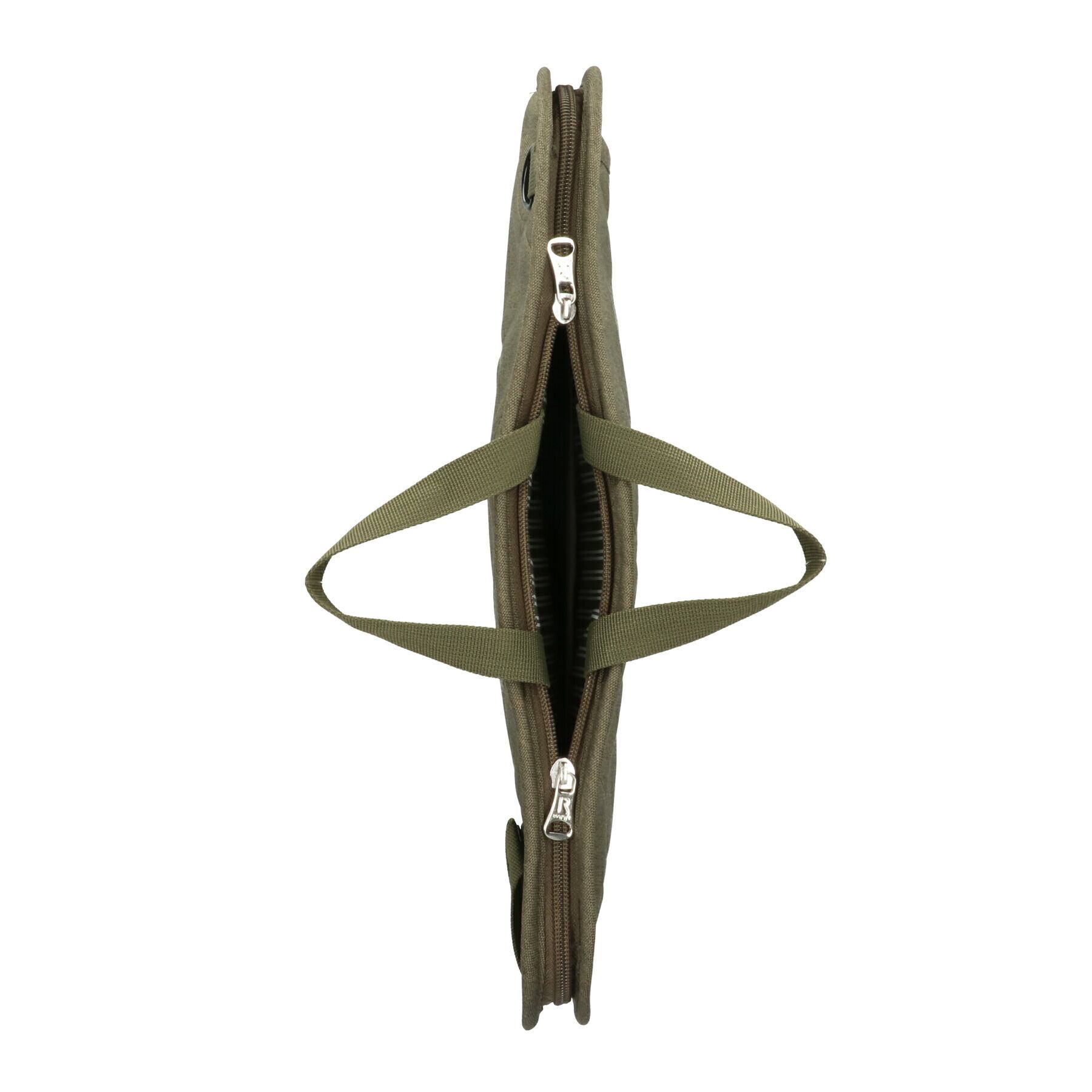 ・内側に納まるハンドルがあるため、メインのバッグからの出し入れもラクラクです。コの字型についたファスナーで、縦横どちらからも中身を出し入れできる仕様。