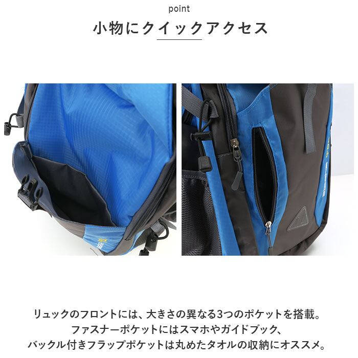・リュックのフロントには、大きさの異なる3つのポケットを搭載。ファスナーポケットにはスマホやガイドブック、バックル付きフラップポケットは丸めたタオルの収納にオススメ。