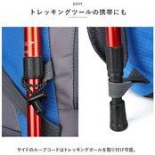 ・サイドのループコードはトレッキングポール、リュック底面のコンプレッションベルトには丸めたシュラフマットなどを取り付け可能。
