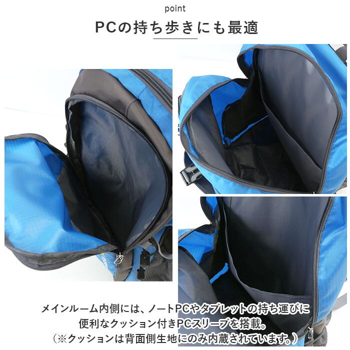 ・メインルーム内側には、ノートPCの持ち運びに便利なクッション付きPCスリーブを搭載。(※クッションは背面側生地にのみ内蔵されています。)