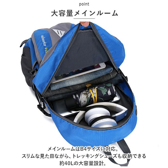 ・メインルームはB4サイズに対応。スリムな見た目ながら、トレッキングシューズも収納できる約40Lの大容量設計。