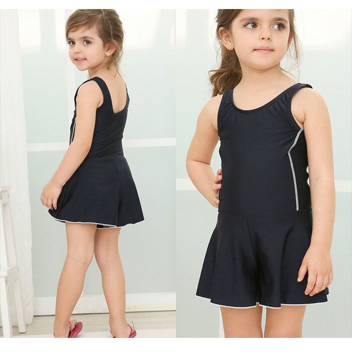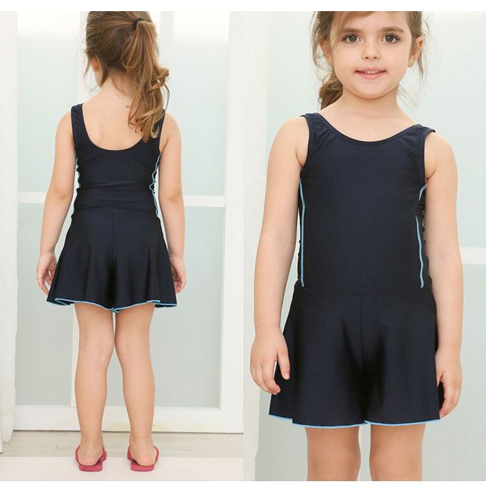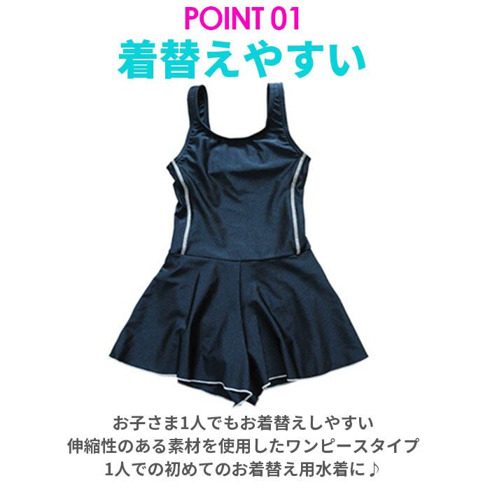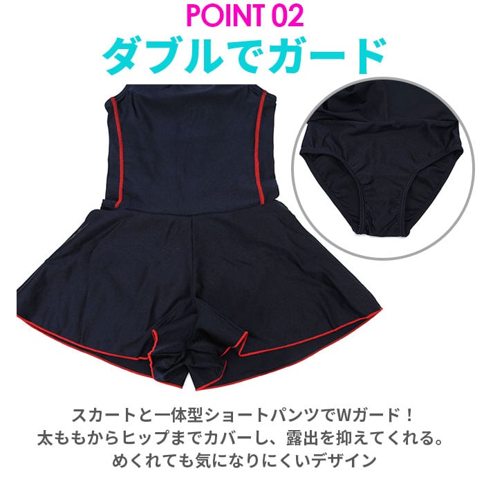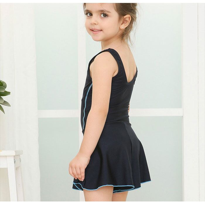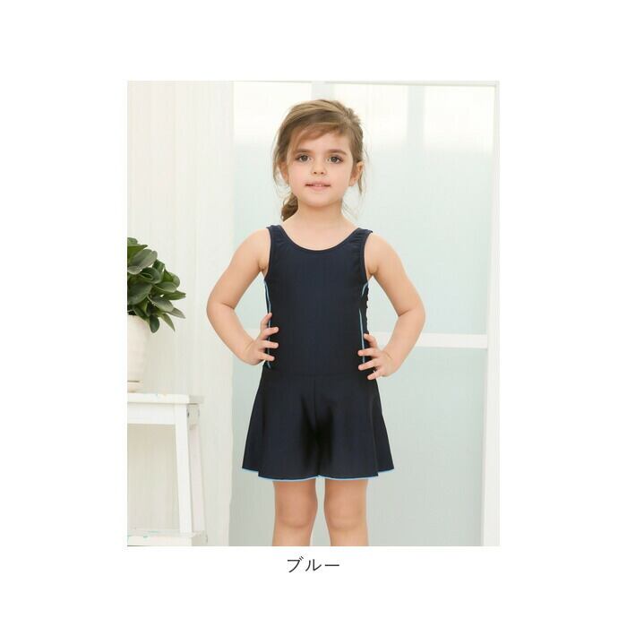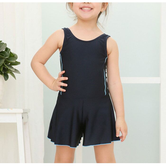 ・ネイビーベースに、上半身のサイドやスカート裾部分に施されたライン使いがアクセント。学校の授業やプール教室、レジャーで活躍。