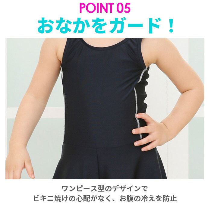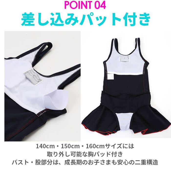 ・バスト・股部分は、成長期のお子さまも安心の二重構造。140cm・150cm・160cmサイズには取り外し可能な胸パッド付きで、バストを優しくカバー。