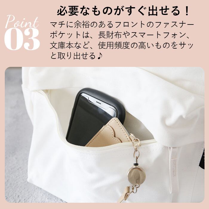 ・マチに余裕のあるフロントのファスナーポケットは、長財布やスマートフォン、文庫本など、使用頻度の高いものをサッと取り出せる♪