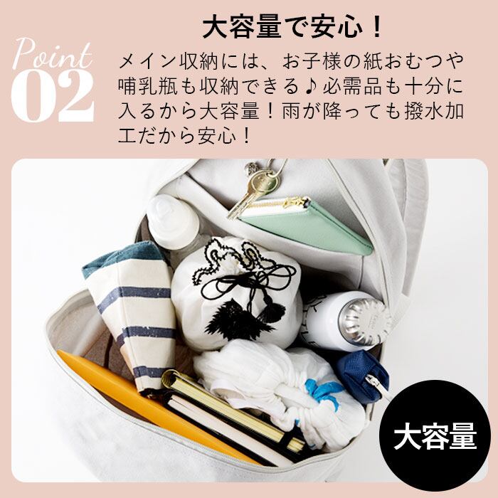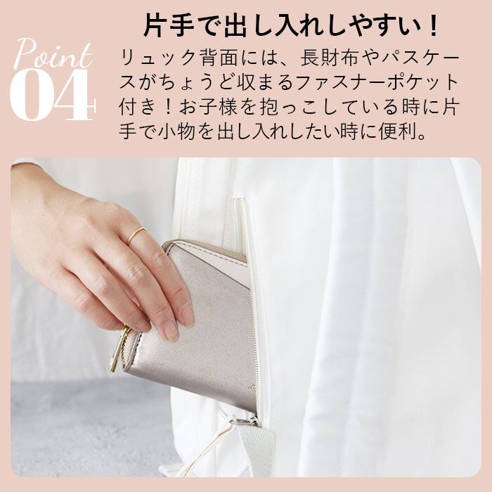 ・リュック背面には、長財布やパスケースがちょうど収まるサイズのファスナーポケット付き。お子様を抱っこしている時に、片手で小物を出し入れしたい時に便利。(リュック内側につながるファスナーではありません)