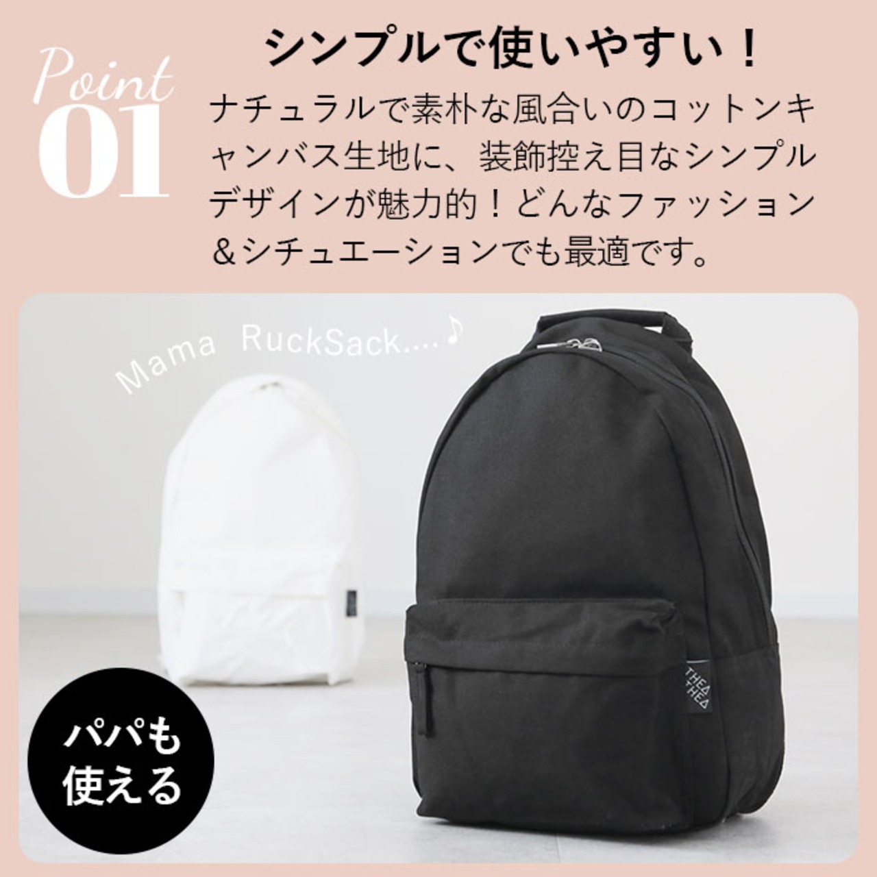 ・ナチュラルで素朴な風合いのコットンキャンバス生地に、装飾控え目なシンプルデザインが魅力的。THEATHEA THREE ママリュック。